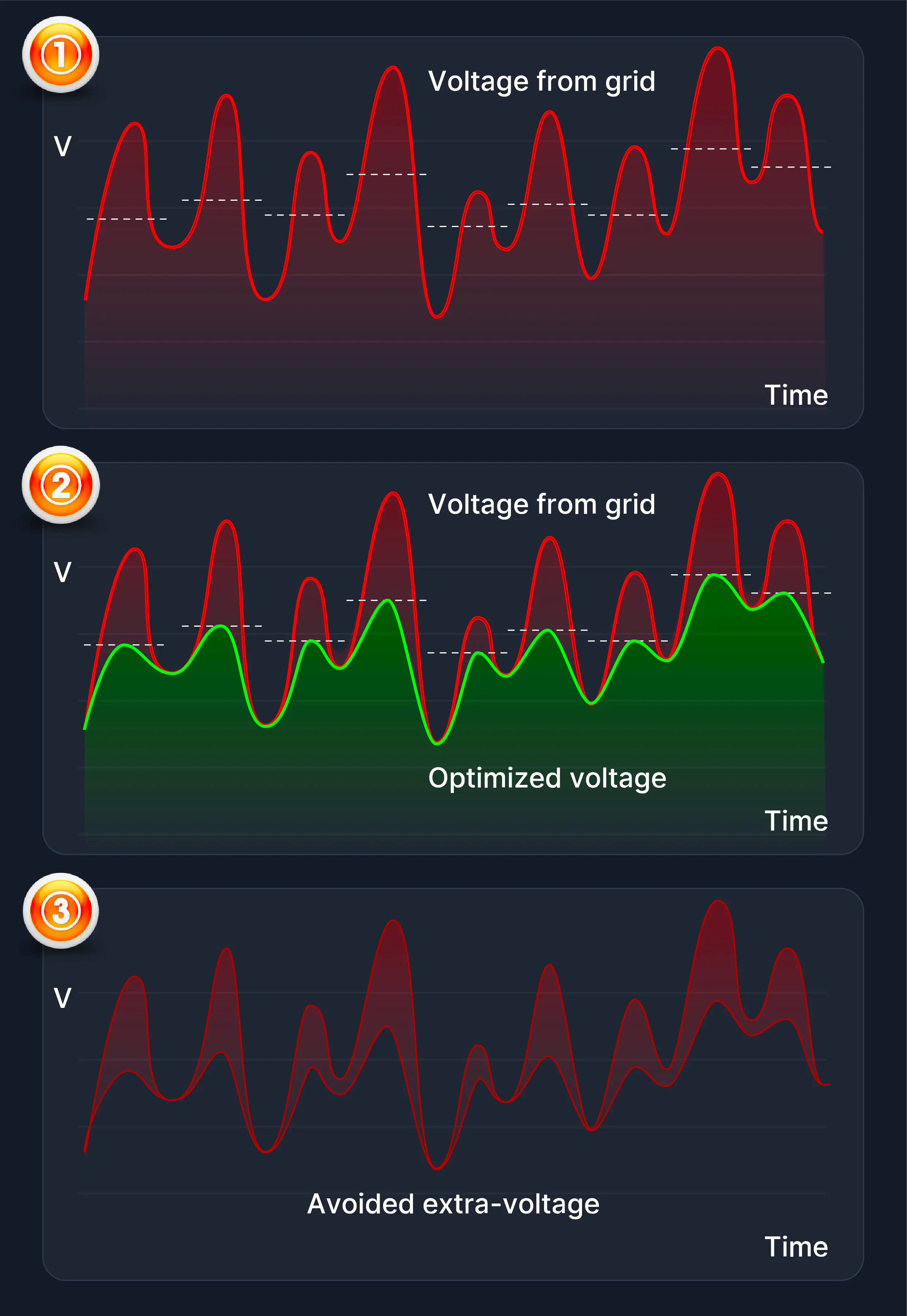 L'eliminazione della porzione di sovratensioni non produttive permette al cliente di consumare meno energia a parità di produzione e, al tempo stesso, proteggere i propri impianti da sbalzi eccessivi di tensione.